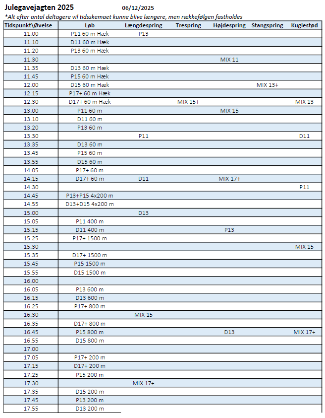 12-13 år | 60m, 60m hæk, 200 m, 600 m, Længdespring, Kuglestød, Højdespring, Stangspring og Stafet MIX (4x200 m) | |